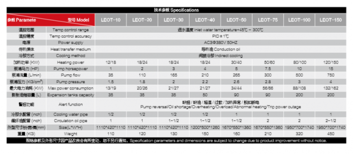 LEOT模溫機屬于高溫油溫機系列,由于采用更先進的控制工藝以及配件,機組的控制溫度可以達到350℃,可以被應用在眾多工業設備控溫場合,例如橡膠硫化、烘房控溫、模具控溫、輥輪控溫、發泡控溫等。其控制溫度可分為300℃/350℃,加熱功率3KW-1200KW可選擇,在選擇時主要依據加熱功率,泵浦性能,冷卻能力等這幾方面,在選購模溫機時,盡量提供詳細的工藝情況給生產廠家,根據需要實際生產工藝來確定加熱功率及泵浦功率,,避免油溫機出現功率過大或不足的現象產生。