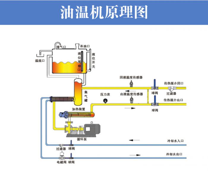 油溫機指將高溫導熱油加熱并傳送到需熱設備,接間給需熱設備升溫和恒溫的一直溫控設備,油溫機組控溫范圍廣范,一般可分為200℃油溫機,300℃油溫機,350℃油溫機三大型號,祝松油溫機最高溫度可做到400℃,其加熱功率依據生產工藝流程的需要定制功率,祝松機械是國內油溫機的生產商,引入了國外技術,優化了設備整體設計方案,為用戶提供價優高質量的油溫控制設備