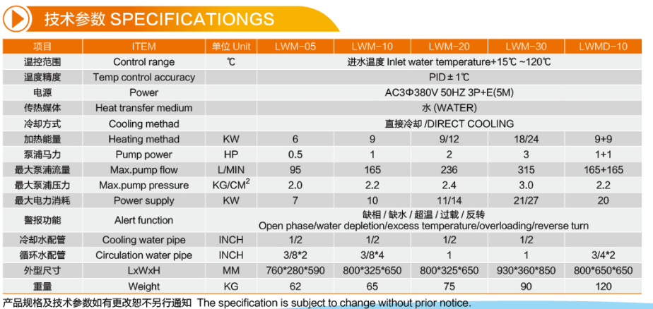 獨有的防爆型管路裝置全由304不銹鋼管一體成型,之擔憂,導熱均勻管阻小,無銹垢.設定溫度,出水溫度,回水溫度分別顯示.具開機自動排氣之功能.隔離式電控箱.組裝施耐德系列電器產品.的延長使用.水泵馬力及加熱功率可定制,加熱功率可切換.瑞典發熱絲,升溫快長,是其他同系產品的3-4倍.歐姆龍溫控器,控制溫度范圍廣,控溫,溫差控制在±1℃以內.微電腦控制系統,可選購PLC和RS485通訊,實現自動化管理.