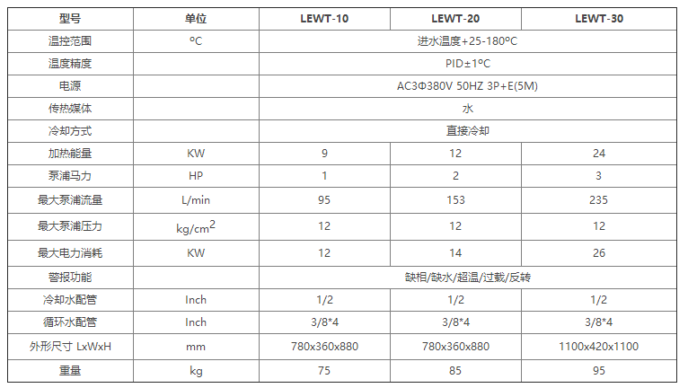 高溫水式模溫機選擇水作為傳熱介質,只需要連接自來水即可,使用方便且無污染.按使用溫度分為120度水溫機,150度水溫機和180度水溫機三大類型.實際控溫溫度大于180℃時,建議采用油溫機.高溫水式模溫機的選配需要根據生產工藝來進行確認,選擇合適的滿足其工藝需求.