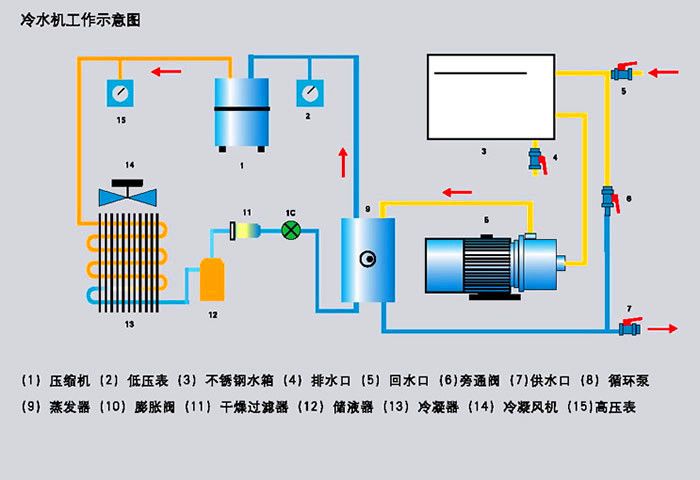 1、配置:谷輪壓縮機,配置電子溫度控制器,控制水溫于5~35度以內,干燥過濾器及臌賬閥,維修手閥接口等裝置,了機器可靠運行,方便了保養維修。