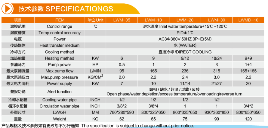 注塑模具控溫機加熱冷卻系統采用雙組PID控制,成型產品的不同,模具所需要的溫度也有所差異,有的塑料制品模具溫度值需要維持在70℃-80℃左右,而有些則需要將模具溫度控制在130℃-150℃左右,根據這一特性,利德盛機械有限公司做出不同的機型,滿足不同生產工藝的要求,如采用水做為傳熱介質的水溫機分三款產品:120℃水溫機,150℃水溫機,180℃水溫機,120℃水溫機較為常見,150℃水溫機和180℃水溫機也被稱為高溫水溫機,一般使用在對車間清潔度較高的無塵車間;采用導熱油作為傳熱介質的油溫機也分三款:200℃油溫機,300℃油溫機和350℃油溫機,在注塑行業中,200℃油溫機足夠滿足生產工藝要求,300℃油溫機與350℃油溫機一般在反應釜控溫,壓延輥筒控溫及壓鑄模具控溫等領域運用較多.