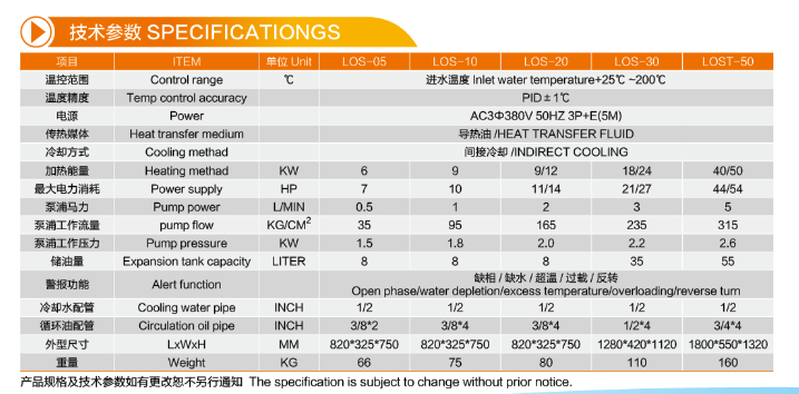 利德盛油溫機溫度控制器采用日本歐姆龍(雙組P.I.D.)觸模式內儲,自動演算可靠可控制在±1℃內,省電35%以上.兩組電熱管,可單獨使用或共同啟用.加溫及冷卻時間快速,溫度穩定,控溫 ±1℃,顯示設定溫度和實際溫度,設定鍵可調節數字增減以滿足需要.,溫度穩定.電熱筒等采用不銹鋼材質,內絲采用瑞典產品.保護及故障指示系統.采用組件,使用年限長.的流程系統設計,操作維修容易.保護及故障顯示,包括泵超載保護,過熱保護,高溫保護,感溫檢測,錯誤警示系統,報警提示功能等.