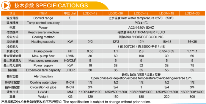 溫控器:采用日本歐姆龍原裝觸摸式數字顯示雙組微電腦自動演算型.循環泵:采用與臺灣軸封泵浦,提供高壓力.減少溫差.節省電能.外型設計:專利分離式控制箱設計,斷絕水氣、油氣熱量侵入,延長電氣零件.機電材料:采用日本[FUJI] [OMRON]等零件組件,2百萬次使用,使用年限長.電路設計:連鎖防錯電路及實用故障指示,完整保護模溫機穩定工作. 管路設計:利德盛采用304不銹鋼一體成型管,全焊接管路設計,耐酸堿,管損小,加熱均勻,且可以降低介質發生熱解反應. 加熱裝置:瑞典電熱絲,微電腦全自動三段式加熱法,比其它品牌模溫機更30%以上,升降溫速度快,溫度更穩定.