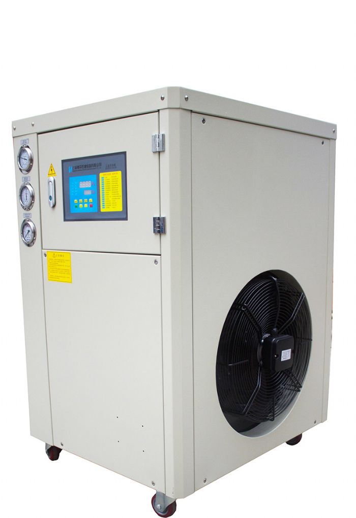 油冷機廠家的小型油冷機是油泵從機床油箱抽取油液至制冷系統中進行熱交換處理,冷卻后的液壓油再經油冷卻機出油管路回到機床油箱中,通過油液的連續循環工作使整個油的油溫持續下降。