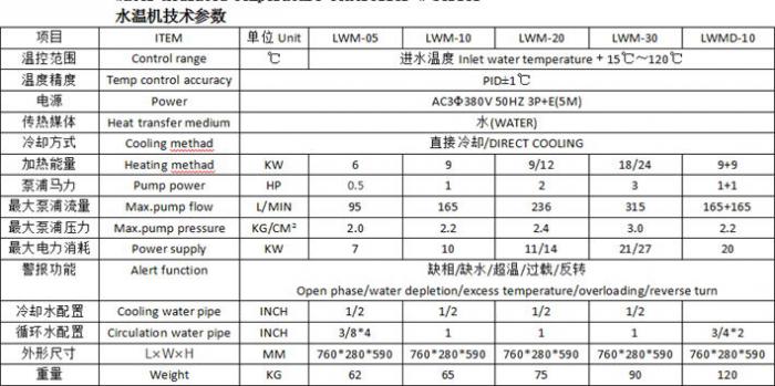 模具水循環模溫機用來控制模具的溫度,主要對模具進行加熱、恒溫,將水加熱至產品成型所需要的溫度,送入模具回圈,迅速提高模具溫度,以提高成型效率。水循環模溫機包括120度水溫機、150度水溫機和180度水溫機三種機型,規格有6KW-1200KW可供選擇.