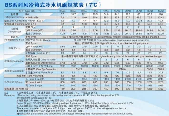 風冷式冷水機組配置精良,零部件均采用產品,的產品組件的了冷水機的質量.大家都知道,制冷工藝的完成,主要有制冷四大件來實現,壓縮機:公司采用谷輪壓縮機作為壓縮冷媒的動力源泉,電機一體化,寧靜省電,之擔憂,渦旋式,無故障運行時間達4萬小時,遠遠高于傳統的活塞式.冷凝器:直接影響到制冷效果,根據工藝的需求,結合現場情況選擇采用殼管式還是翅片式;蒸發器:制冷工藝的完成主要在此部件完成,冷媒在此部件中完成氣液轉換,吸收大量的熱量,產生冷凍水,由合資廠家提供.膨脹閥,采用的丹弗斯膨脹閥,冷媒噴射速度快,產生冷凍水效率高.